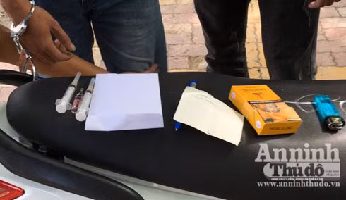 Khi kiểm tra hành chính, tổ công tác phát hiện trong túi quần nam thanh niên có một gói nhỏ bột màu trắng, cùng 2 kim tiêm bằng nhựa, một ống nước thủy tinh trong suốt.