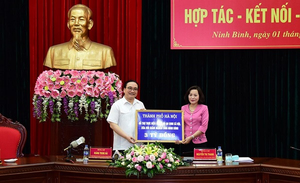 Tại buổi làm việc, Hà Nội đã trao tặng tỉnh Ninh Bình 3 tỷ đồng thực hiện nhiệm vụ an sinh xã hội và xóa đói giảm nghèo.