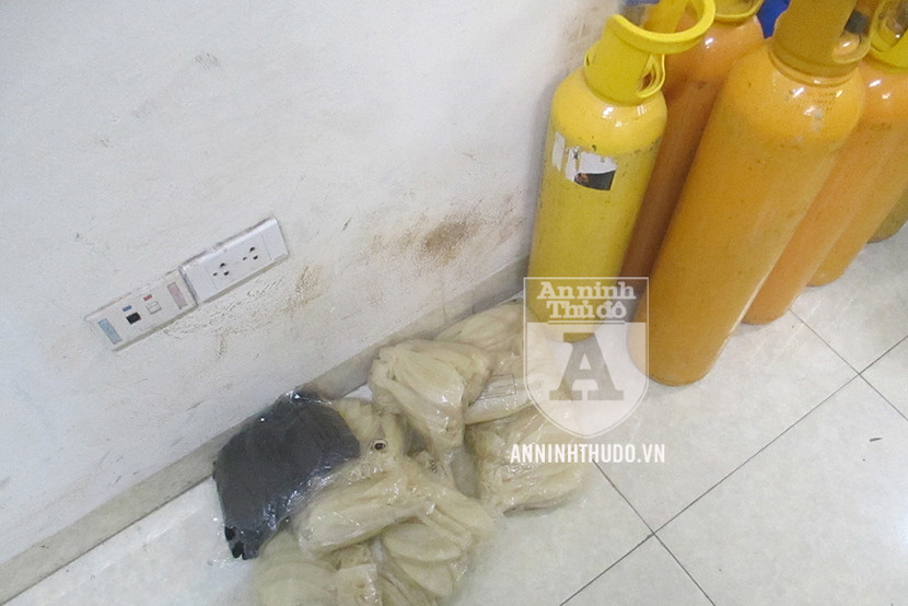 Tại hiện trường, công an phát hiện có 26 bình khí cười với các kích cỡ và màu sắc khác nhau, cùng nhiều túi bóng bay chưa bơm. Đối tượng nam có mặt tại đây được xác định là Nguyễn L (SN 1999, quê quán ở Nghệ An). L làm nhiệm vụ trông coi kho hàng, và vận chuyển bình khí theo các đơn đặt hàng.