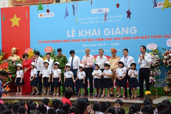 Tại trường Tiểu học Trần Quốc Toản đã trao tặng 338 mũ bảo hiểm đạt chuẩn và hướng dẫn đội mũ bảo hiểm cho học sinh bước vào lớp 1, năm học 2019 - 2020.