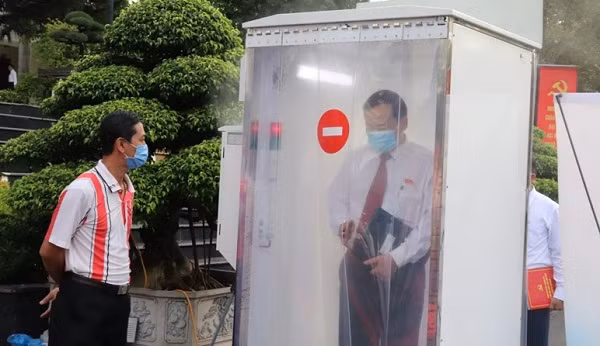 Các đại biểu dự đại hội tiến hành các biện pháp khử khuẩn phòng dịch Covid-19