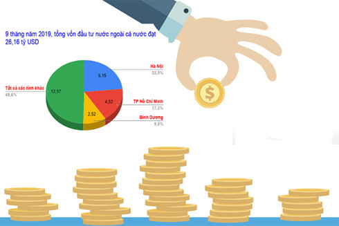 Theo Báo cáo của Cục Đầu tư nước ngoài (Bộ KH&ĐT), trong 9 tháng năm 2019, tổng vốn đầu tư nước ngoài cả nước đạt 26,16 tỷ USD, Hà Nội thu hút nhiều vốn FDI nhất với tổng số vốn đăng ký 6,15 tỷ USD, chiếm 23,5% tổng vốn đầu tư.
