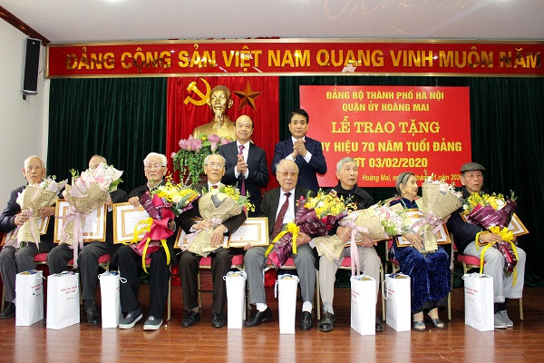 Chủ tịch UBND TP Nguyễn Đức Chung trao tặng các đảng viên lão thành quận Hoàng Mai Huy hiệu 70 năm tuổi Đảng
