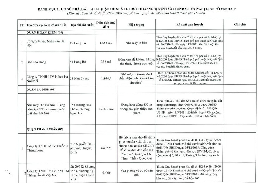 Chi tiết danh mục 10 cơ sở nhà đất cần phải di dời, xem bảng dưới đây: