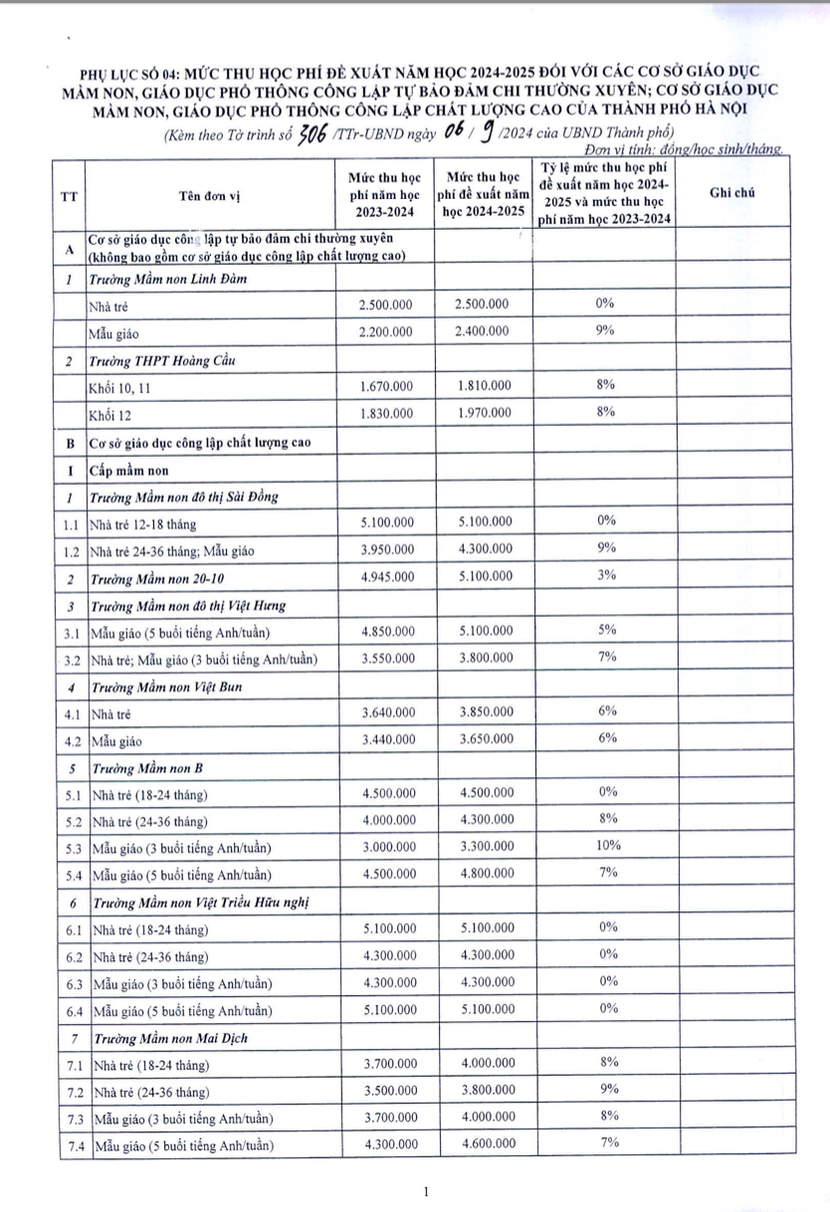 UBND TP Hà Nội vừa trình HĐND TP dự thảo Nghị quyết quy định mức thu học phí đối với các cơ sở giáo dục mầm non, giáo dục phổ thông công lập tự bảo đảm chi thường xuyên; cơ sở giáo dục mầm non, giáo dục phổ thông công lập chất lượng cao của thành phố Hà Nội năm học 2024-2025.