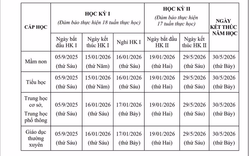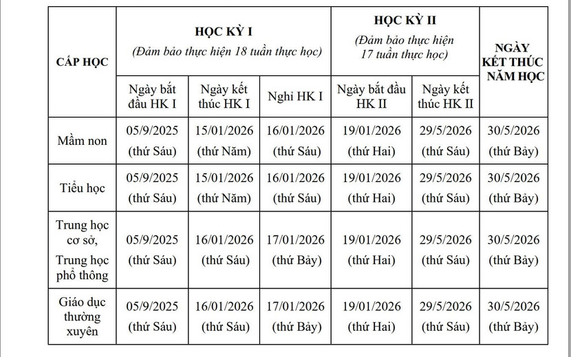Khung kế hoạch thời gian năm học 2025-2026 của thành phố Hà Nội quy định, các trường kết thúc học kỳ I trước ngày 18-1-2026; hoàn thành chương trình và kết thúc năm học trước ngày 31-5-2026; xét công nhận hoàn thành chương trình tiểu học và xét công nhận tốt nghiệp trung học cơ sở trước ngày 30-6-2026; hoàn thành tuyển sinh các lớp đầu cấp trước ngày 31-7-2026.