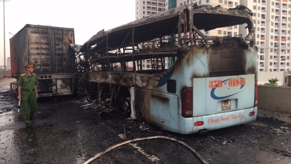 Vào thời điểm trên, cả hai phương tiện di chuyển từ hướng Pháp Vân về Mai Dịch. Chiếc xe container mang BKS 34C-193.15 đi cùng chiều phía trước xe khách mang BKS 37B-018.42. Khi đi đến điểm trên, xe khách đã đâm vào đuôi xe container. Cú đâm với lực rất mạnh đã khiến đầu xe khách dính vào đuôi container. Chiếc xe khách bốc cháy. Ngọn lửa dữ dội lan nhanh khiến toàn thân xe khách và phía trong bị thiêu rụi.