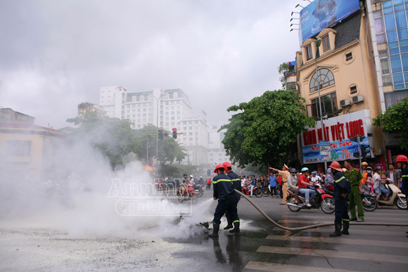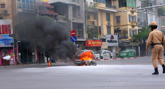 Nhìn thấy chiếc xe máy bốc cháy giữa đường, ngay lập tức các chiến sĩ Đội Cảnh sát giao thông số 3, Công an thành phố Hà Nội đang làm nhiệm vụ tại chốt giao thông Cát Linh – Tôn Đức Thắng đã phối hợp cùng Công an phường Cát Linh, quận Đống Đa, dùng hàng chục bình chữa cháy mini tiến hành dập lửa, đồng thời gọi cho lực lượng Cảnh sát PCCC.