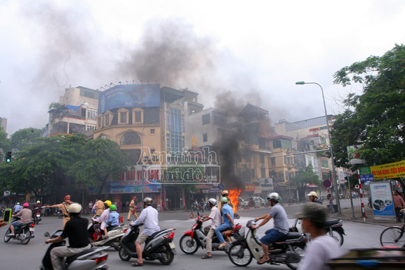 Vào khoảng thời gian trên, chị Đặng Thị Hường, sinh năm 1986, trú tại số nhà 2, Đẩu Long, Tân Bình, thành phố Ninh Bình, điều khiển xe máy nhãn hiệu Novo, mang BKS: 30M1- 2378, đang lưu thông từ phố Cát Linh rẽ ra phố Tôn Đức Thắng, khi đi đến giữa ngã tư thì chị Hường cảm thấy xe nóng rực, cùng lúc đó người dân đi đường hô “cháy xe rồi”, chị Hường hoảng sợ, dừng xe bỏ chạy.