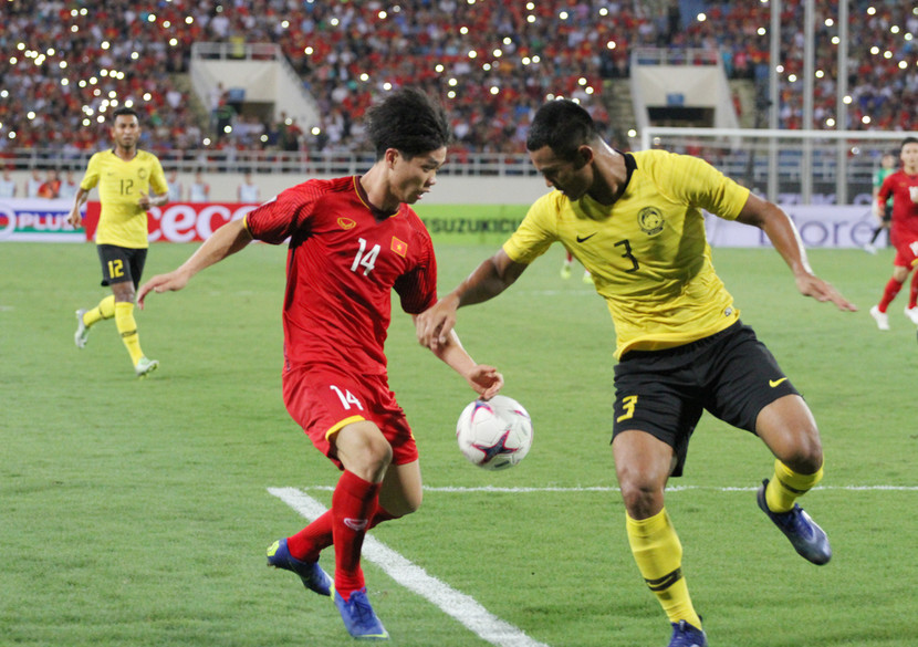 Tại vòng bảng, ĐT Việt Nam (áo đỏ) đã thắng Malaysia 2-0 trên sân Mỹ Đình