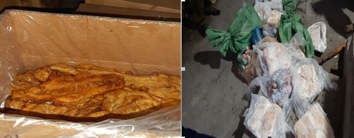 Tại đây, cơ quan chức năng phát hiện đang tập kết 1,1 tấn sản phẩm động vật (gồm 500kg lòng lợn đã qua sơ chế nhiệt và 600kg thịt lợn tươi) bảo quản trong kho lạnh cấp đông, không có giấy tờ chứng minh nguồn gốc xuất xứ.