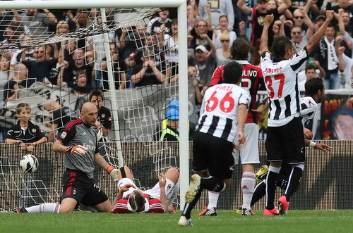 Thủ môn Abbiati (bìa trái) của AC Milan bất lực nhìn các cầu thủ Udinese