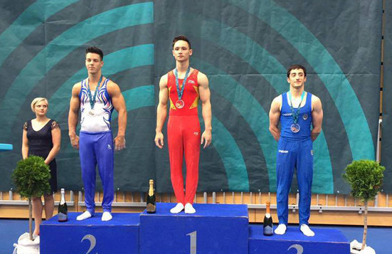 Đinh Phương Thành (giữa) trên bục nhận HCV xà kép