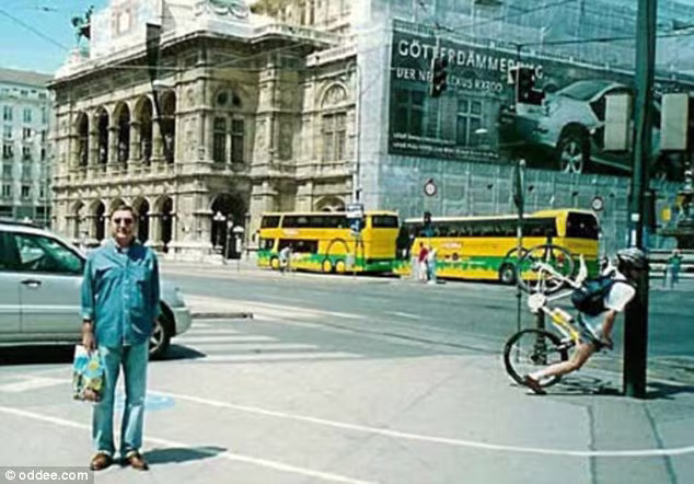 Một khách du lịch chụp ảnh kỉ niệm tại Berlin, nhưng không, người đạp xe kia bị đâm vào cột đèn