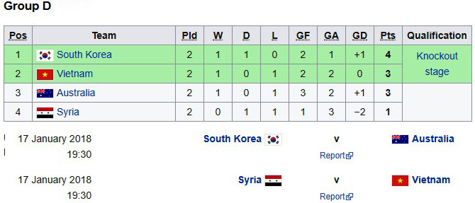 Kết thúc 2 lượt trận, cục diện bảng D như sau: U23 Hàn Quốc có 4 điểm xếp thứ nhất, U23 Việt Nam cùng 3 điểm nhưng xếp trên U23 Australia nhờ thành tích đối đầu. Cuối bảng là U23 Syria với 1 điểm.