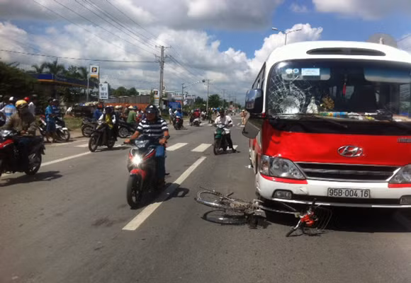 Khi đến đoạn đường trên, xe khách bất ngờ tông vào hai mẹ con lưu thông cùng chiều bằng xe đạp, kéo lê đi một đoạn trên 30m.