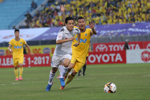 CLB Thanh Hóa (áo sẫm) hụt hơi để Hà Nội chiếm ưu thế vô địch lượt đi