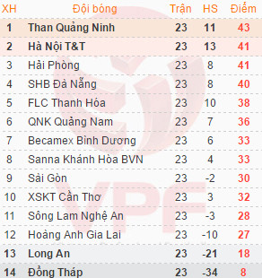 Để thua trận này, Hải Phòng vẫn 41 điểm, tự đánh mất lợi thế vô địch và mất luôn ngôi nhất bảng khi rơi xuống vị trí thứ 3. Cùng 41 điểm nhưng Hà Nội T&T (thứ 2) nhỉnh hơn về chỉ số phụ. Đặc biệt ở trận đấu muộn của vòng 23, Than Quảng Ninh đánh bại HAGL 3-1, qua đó soán ngôi đầu bảng với 43 điểm.