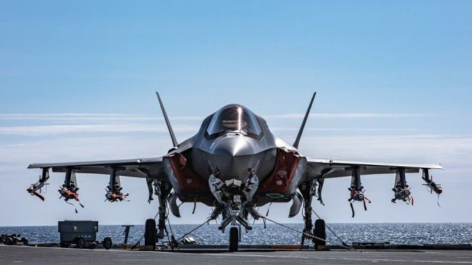 Hình ảnh được đăng tải vào hôm 23-10 cho thấy, F-35B đang mang theo 2 tên lửa không đối không AIM-132 ASRAAM, 2 tên lửa AIM-120 AMRAAM, cùng với đó là bom dẫn đường chính xác Paveway IV.