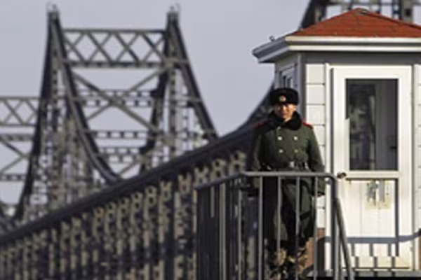 Lính Triều Tiên gác tại cửa khẩu trên cây cầu Hữu Nghị bắc qua sông Áp Lục nối với Đan Đông, Trung Quốc
