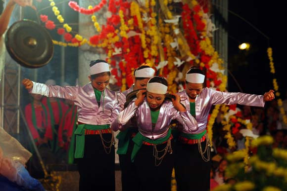 Trước khi màn pháo hoa rực sáng tại điểm cầu Hòa Bình đã diễn ra những tiết mục văn nghệ mừng Đảng, mừng Xuân, mường đất nước. Những thiếu nữ trong trang phục truyền thống của đồng bào Mường đã gõ cửa thềm xuân bằng những màn chiêng ngân vang cùng điệu múa đậm đà bản sắc xứ Mường.