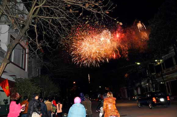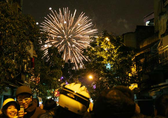 Mặc dù tiết trời Hà Nội đã giảm hơn 10 độ C so với ngày hôm trước, song không khí xuân đã làm tan cái lạnh giá. Từ khoảng 21h tối, từng dòng người theo các ngả đường vẫn tiếp tục đổ về khu vực trung tâm của Thủ đô để đắm chìm trong mùa xuân mới hân hoan. Tại khu vực xung quanh hồ Gươm, khi những bông pháo hoa bung nở trên bầu trời đêm, mở màn cho thời khắc giao thừa thiêng liêng, cũng là lúc các bạn trẻ đồng thanh ca vang lên bài hát chúc mừng năm mới. Nhiều đôi bạn đã dành cho nhau những tình cảm thật nồng thắm bằng những cái nắm tay thật chặt cùng những nụ hôn ngọt ngào.
