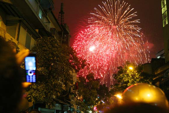 ...và những bông pháo rực sáng trên nền trời đêm 30 (Ảnh: Cao Minh)