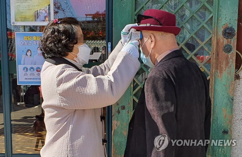Kiểm tra thân nhiệt du khách trước cửa một ngôi đền ở Seoul