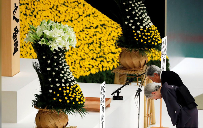 Nhật hoàng Akihito và Hoàng hậu Michiko cúi chào trước một bàn thờ trong khoảnh khắc tưởng niệm những người thiệt mạng trong Thế chiến thứ hai tại Budokan Hall, Tokyo ngày 15-8-2018
