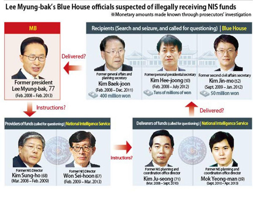 Các trợ lý chủ chốt của cựu Tổng thống Lee Myung-bak (trái, hàng trên) bị nghi nhận tiền hối lộ từ quỹ của NIS, trong đó có ông Kim Jin-mo (phải, hàng trên)