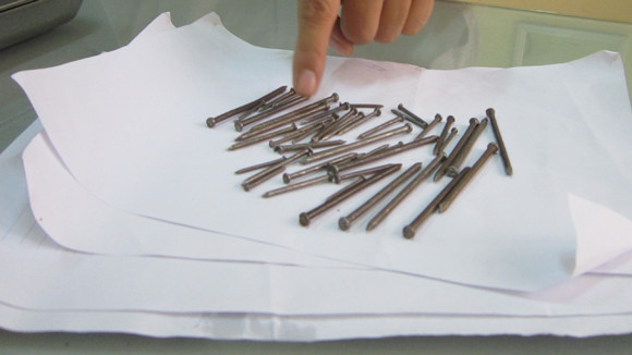 Sáng 21-8, chúng tôi đã trao đổi với đại diện CAP Kim Mã, quận Ba Đình và được biết, vào khoảng 19h, sau trận mưa lớn chiều 20-8, một số người dân đang tham gia giao thông trên trục đường từ Sơn Tây hướng Kim Mã, đến khách sạn Daewoo phát hiện bị xịt lốp xe và phải dắt bộ tìm điểm vá. Ngay sau khi nhận được tin báo của người dân về hiện tượng này, CAP đã nhanh chóng triển khai lực lượng kiểm tra và tìm hiểu nguyên nhân. Quả thật, số đinh nhọn xuất hiện trên đường tương đối nhiều, mật độ dày đặc. Hiện số đinh do người dân nhặt được giao nộp cho CAP cũng lên tới hàng kg với đủ loại kích cỡ.