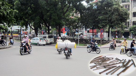 Trao đổi với phóng viên ANTĐ, anh Trần Anh Minh ở phố Hoàng Hoa Thám, quận Ba Đình cho biết, 19h15 tối 20-8, khi đang đi từ phố Ngọc Khánh về nhà, đến đoạn đầu phố Vạn Bảo, anh Minh bỗng nhiên thấy tay lái xe bị lạng, xe chạy chậm lại. Dù trời vẫn đang mưa nhưng để đảm bảo an toàn, anh đã dừng xe, dắt đến đoạn có đèn sáng để kiểm tra. Sau khi dùng điện thoại soi kỹ, anh Minh phát hiện cả 2 lốp xe Spacy của mình đã bị dính đinh. Do vết thủng ở lốp trước nhỏ nên anh Minh đã yêu cầu người vá xe đầu phố vá lại với giá 60.000 đồng. Lốp sau bị dính đến 2 đinh nên anh Minh phải quyết định thay lốp với với tổng chi phí là 600.000 đồng. “Trong lúc chờ vá xe, tôi nhìn xuống lòng đường thì thấy đinh nhọn rải la liệt. Do đó, không chỉ có tôi mà còn hàng chục người nữa cũng đứng dưới mưa xếp hàng chờ vá xe. Tôi không ngờ một tuyến phố giao thông huyết mạch ở trung tâm thành phố mà nạn “đinh tặc” lại lộng hành như thế này”.