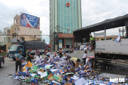 Nhiều người dân đã giúp tài xế gom lại số bia đổ xuống đường (Ảnh: Hoài Thương)