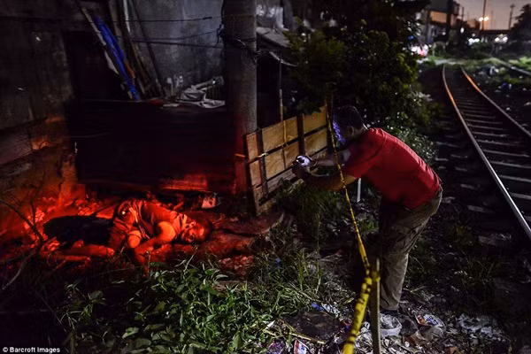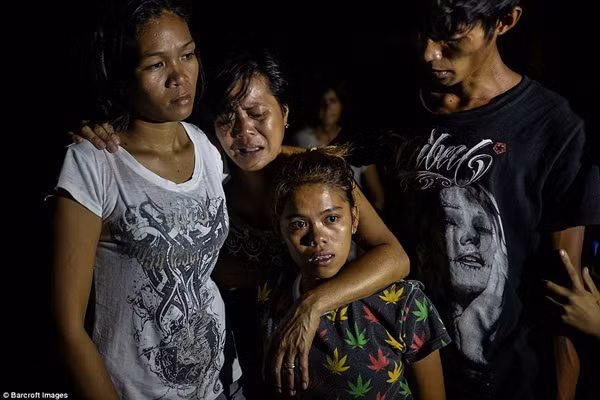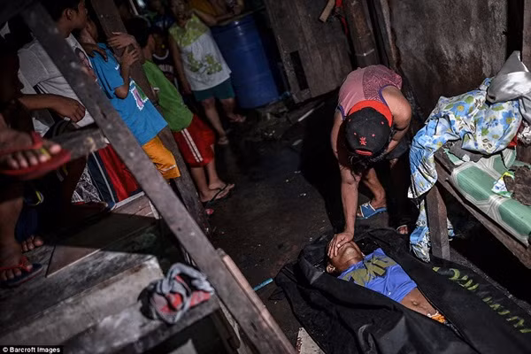 Một người thân đang vuốt mắt cho tội phạm ma túy sau khi bị cảnh sát bắn chết, trước sự chứng kiến của người thân và trẻ em