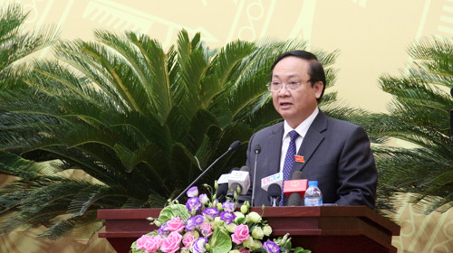 Phó Chủ tịch UBND TP Hà Nội Nguyễn Thế Hùng báo cáo tình hình thực hiện kết luận tại phiên chất vấn kỳ họp thứ 3 HĐND TP