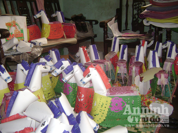 Bà Thúy bảo cả gia đình ai cũng biết làm hàng mã từ lúc còn tấm bé. Những ngày cuối năm này gia đình bà làm tất bật cả ngày lẫn đêm mà vẫn không có hàng để bán. “Từ khoảng cuối tháng 11 âm lịch là chúng tôi đã chuẩn bị sẵn nguyên vật liệu để làm cho đến Tết. Mấy hôm nay người ta về lấy hàng, đặt hàng liên tục. Cũng mệt lắm nhưng cả năm chỉ được mỗi dịp này nên vợ chồng tui cũng gắng làm để bù ra giêng nhàn rỗi”, bà Thúy vui vẻ nói. Theo bà Thúy cho biết thì hàng mã có rất nhiều loại dành cho những lễ khác nhau, tùy vào mỗi loại lễ mà sẽ có một bộ hàng mã phù hợp. Ví như cúng ông bà thì sẽ có đủ bộ đồ gọi là bộ trạng gồm: quạt, đôi hia, áo, ngựa… nhưng nếu cúng vong ông thì sẽ có thêm cây dù, cúng vong bà sẽ có thêm chiếc nón.