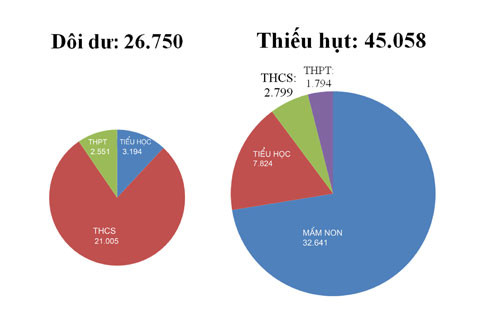 Được biết, những địa phương có lượng dôi dư giáo viên cấp THCS lớn gồm: Thái Bình: 1.224 người; Phú Thọ: 1.191, Thanh Hóa: 2.188, Nghệ An: 1.742, Quảng Nam: 1.096. Trong khi đó, các tỉnh còn thiếu giáo viên mầm non gồm: Sơn La: 1.040, Bắc Giang: 1.921, Thái Bình: 1.500, Thanh Hoá: 1.405, Nghệ An: 3.328, TP.HCM: 1.195. Ở bậc tiểu học, một số địa phương thiếu nhiều giáo viên như Hà Nội: 2.696, Sơn La: 1.133, Gia Lai: 1.196.