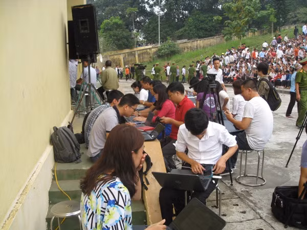 Khá đông phóng viên theo dõi tòa phải "tùy nghi" tác nghiệp. Ảnh: Trịnh Tuyến
