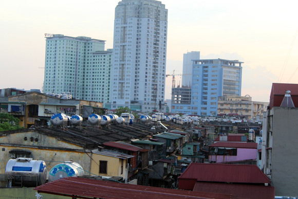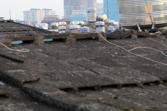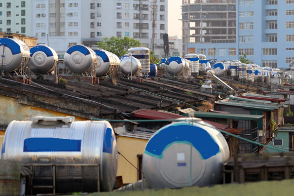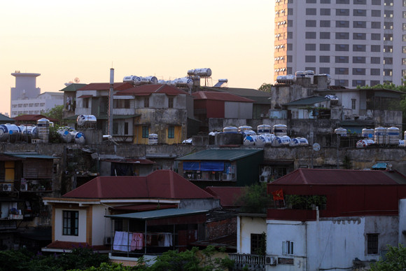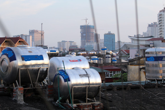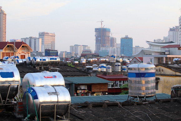 Trên nóc nhiều khu chung cư cũ của Hà Nội, để cung cấp nước sinh hoạt cho gia đình, người dân đã lắp đặt hàng loạt bồn inox chứa nước. Các tòa nhà phải chịu thêm lực đè cả trăm tấn mà thiết kế ban đầu chưa hề tính đến. Vì đây là giải pháp khắc phục tình thế, nhưng lại phù hợp với mỗi gia đình nên những khu chung cư cũ ở Thành Công, Giảng Võ, Trung Tự… tự lúc nào đã thành “bảo tàng” bình inox chứa nước.