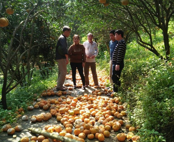 Tại vùng trồng cam sành của hợp tác xã cam VietGAP xã Vĩnh Hảo, huyện Bắc Quang tỉ lệ trung bình quân ước khoảng 40,3%, có vườn lên đến 70%, số lượng cam bị rụng tương đương 1.210 tấn...