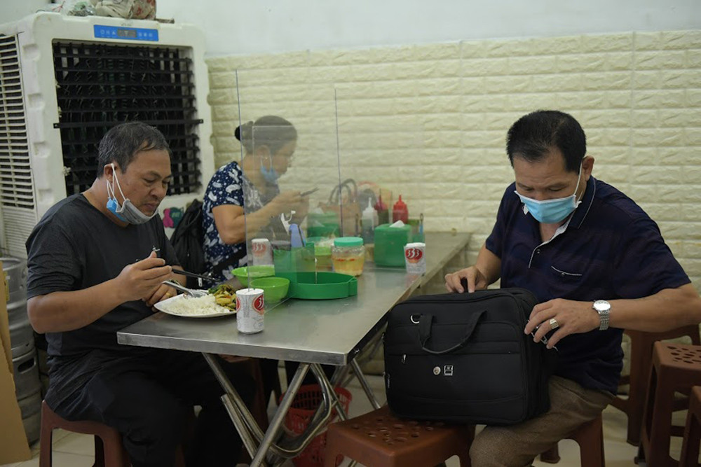 ANTD.VN - Nhiều cửa hàng kinh doanh ăn uống tại Hà Nội đã lắp vách ngăn giữa các bàn, chuẩn bị nước rửa tay sát khuẩn... chấp hành nghiêm việc giãn cách để phòng chống dịch Covid-19.