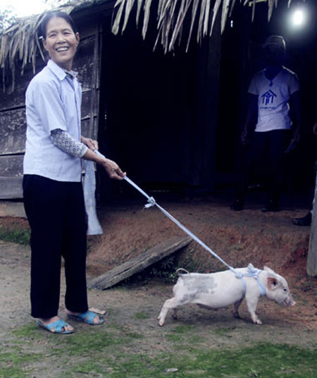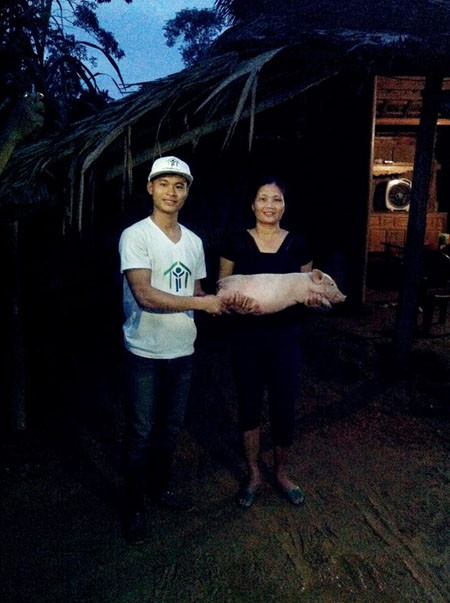 Thành Trung, chủ hội Từ Thiện Thật chở lợn đến tặng các hộ gia đình