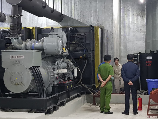 Lực lượng công an kiểm tra tại buồng máy phát điện để điều tra xác minh vụ chảy dầu