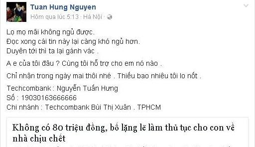 Ngay khi đọc được bài viết này, Tuấn Hưng đã lập tức kêu gọi mọi người cùng chung sức đóng góp để cứu giúp hai cha con trong câu chuyện nêu trên: “Lọ mọ mãi không ngủ được. Đọc xong cái tin này lại càng khó ngủ hơn. Duyên tới thì ta lại gánh vác”. Kèm với lời kêu gọi trên, Tuấn Hưng nói thêm: “Chỉ nhận trong ngày mai thôi nhé. Thiếu bao nhiêu tôi lo nốt”.
