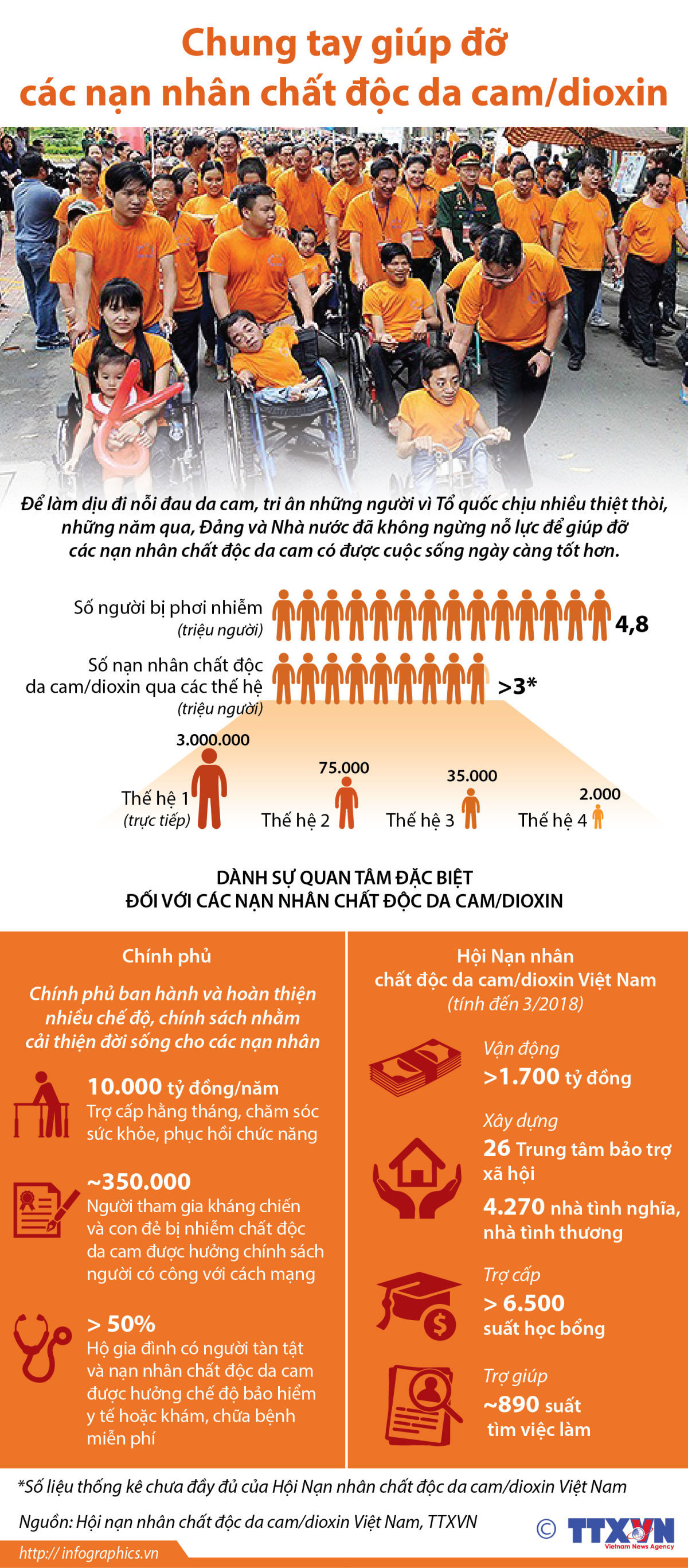 Theo Hiệp hội nạn nhân chất độc da cam Việt Nam (VAVA), ước tính có khoảng 4,8 triệu người Việt Nam bị phơi nhiễm chất độc da cam/dioxin. Ngoài hàng trăm nghìn người đã thiệt mạng vì phơi nhiễm độc chất đáng sợ này, con cháu của họ cũng đang phải vật lộn chống chọi với các di chứng, bệnh tật hiểm nghèo như liệt hoàn toàn hay một phần cơ thể, mù lòa, câm điếc, thiểu năng trí tuệ, tâm thần, ung thư, dị dạng, dị tật bẩm sinh…
