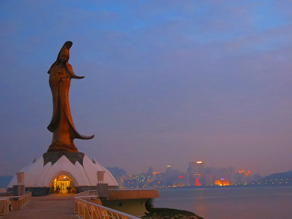 Tượng Phật Bà Quan Âm trên chùa Kun Lam lúc hoàng hôn.