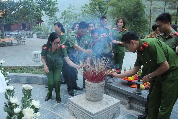 Cán bộ chiến sỹ trẻ dâng một cành hoa, thắp một nén hương tưởng niệm tại mộ anh Kim Đồng
