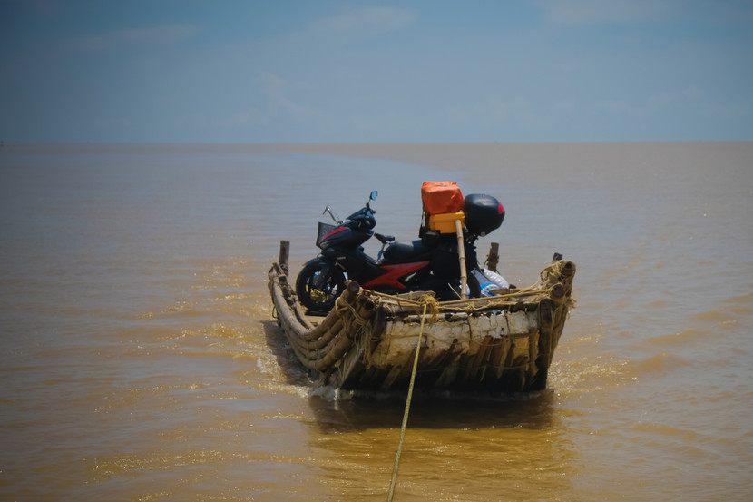 Lekima Hùng và "bạn đồng hành" (xe máy) di chuyển qua sông Mã (Ảnh: Lekima Hùng)