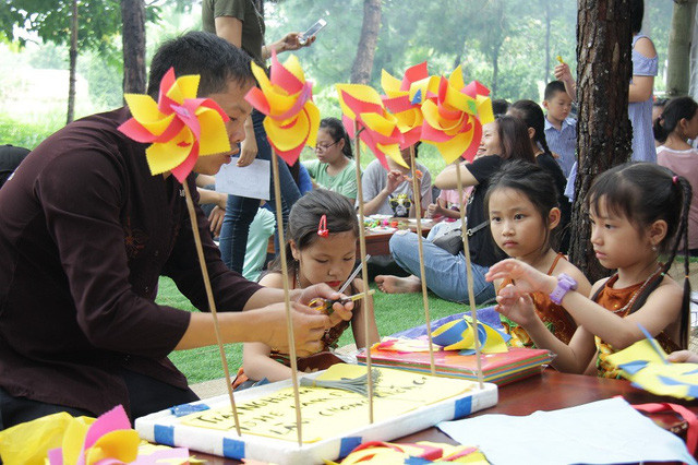 Bên cạnh đó, chương trình còn diễn ra các hoạt động tái hiện không gian dành cho tuổi thơ với các trò chơi dân gian và hoạt động trải nghiệm nghề thủ công truyền thống như: làm chuồn chuồn tre, nặn tò he, nặn bong bóng thành những đồ vật hình thù ngộ nghĩnh, trải nghiệm làm nón...