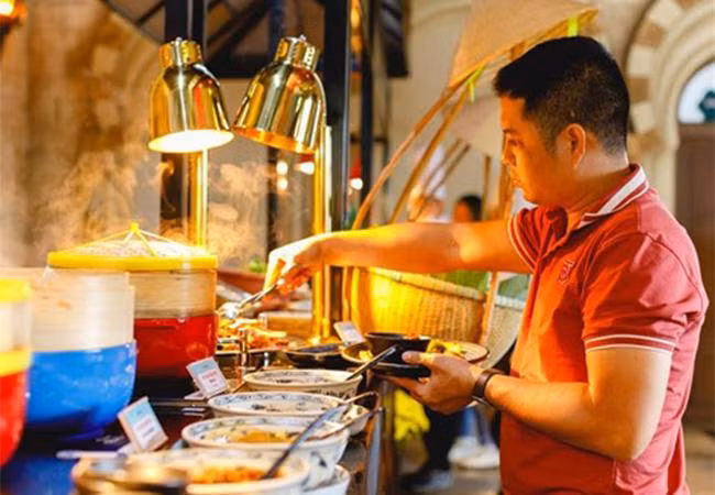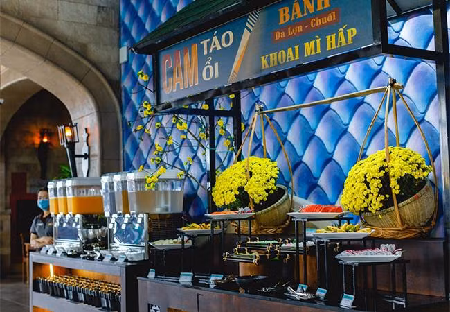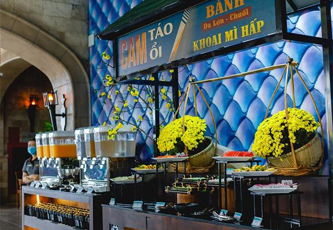 Nếu muốn dành nhiều thời gian cho trải nghiệm ẩm thực giữa mây trắng bềnh bồng, nhà hàng buffet Vân Sơn trên đỉnh núi là lựa chọn hoàn hảo. Nhà hàng phục vụ hơn 80 món ăn nổi tiếng các vùng miền với sức chứa lên tới 650 người, mở cửa phục vụ khách từ 10h30-15h mỗi ngày.